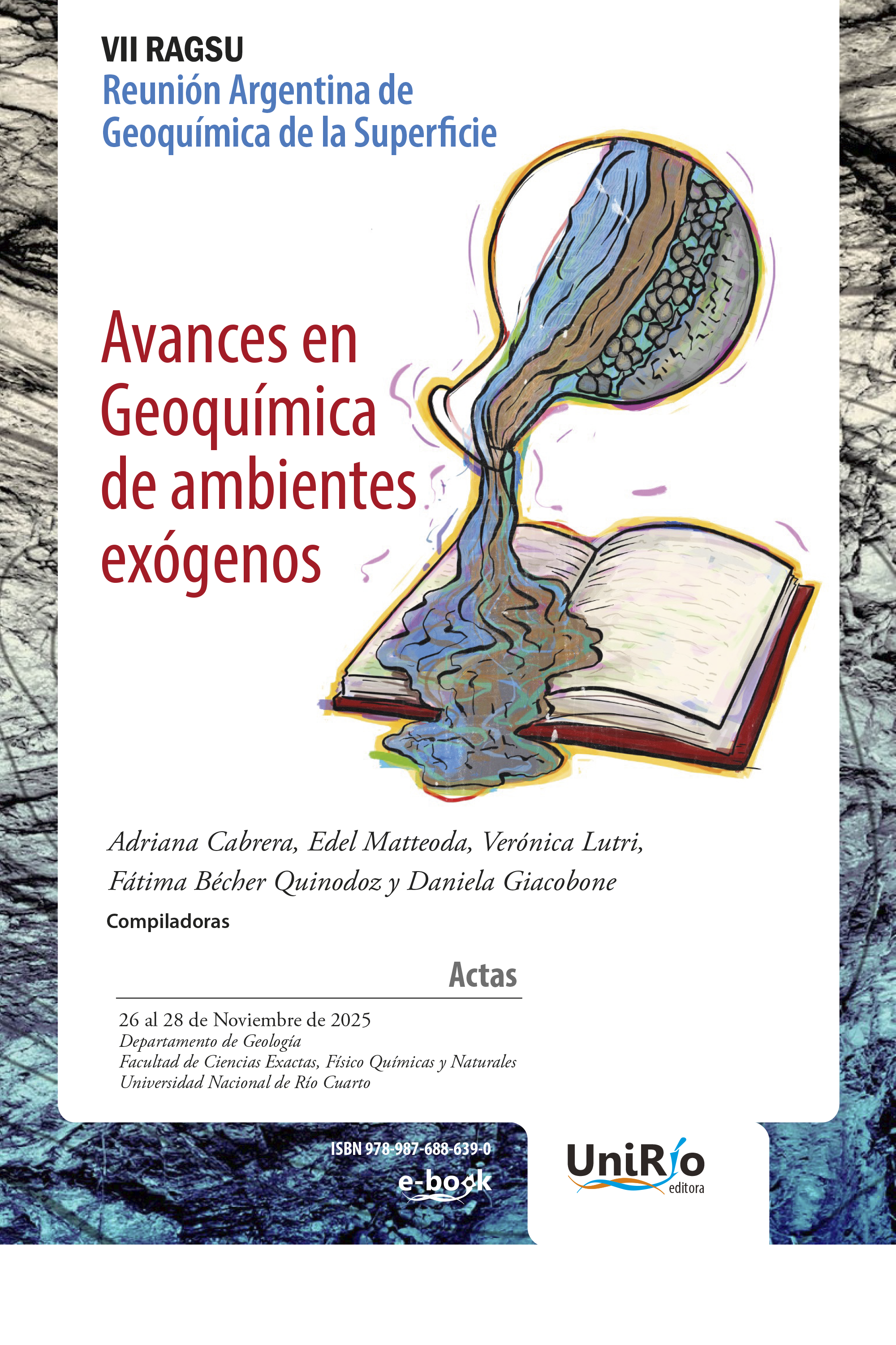 El libro reúne los trabajos presentados en la VII Reunión Argentina de Geoquímica de Superficie (VII RAGSU), centrados en investigaciones sobre geoquímica en ambientes de baja temperatura y presión. Estas contribuciones promueven el intercambio entre profesionales nacionales e internacionales, enriqueciendo el campo mediante la discusión de resultados y el diseño de nuevas líneas de investigación. La geoquímica de superficie aborda problemáticas clave con aplicaciones en la gestión de recursos hídricos, la evaluación ambiental, el uso sustentable de recursos naturales y la mitigación de procesos de degradación. Por ello, la difusión de estos avances resulta relevante para investigadores, profesionales, gestores y tomadores de decisiones. Las actas integran trabajos interdisciplinarios de geólogos, químicos, biólogos, hidrólogos, ingenieros y otros especialistas, fortaleciendo la colaboración científica y la integración de conocimientos. Su publicación constituye tanto un registro académico como un instrumento para estimular nuevas investigaciones, enriquecer la formación de estudiantes y favorecer la articulación con organismos públicos y privados.