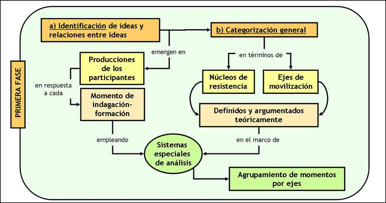 El segundo procedimiento de análisis, aún en la primera fase, consistió en caracterizar a estas ideas o sistemas ideas identificados en términos de un par general de categorías que hemos llamado núcleos de resistencia y ejes de movilización. La categoría núcleos de resistencia alude a aquellos sentidos más clásicos acerca de la ciencia y su enseñanza, que trasuntan imágenes y concepciones incompletas, reduccionistas o simplificadoras al respecto. Por su parte, la categoría ejes de movilización reúne aquellos argumentos, decisiones y posiciones de los participantes que introducen indicadores de novedad, reformulación o construcción de nuevos significados en niveles de mayor complejidad e integración. Los indicadores para una y otra categoría fueron definidos y argumentados teóricamente en el marco de un sistema de análisis específico definido para cada agrupamiento. La construcción de estos sistemas de análisis especiales requirió de una tarea bastante ardua de lectura, estudio y revisión de la literatura de investigación más reciente en relación con cada ámbito de problemas considerados.