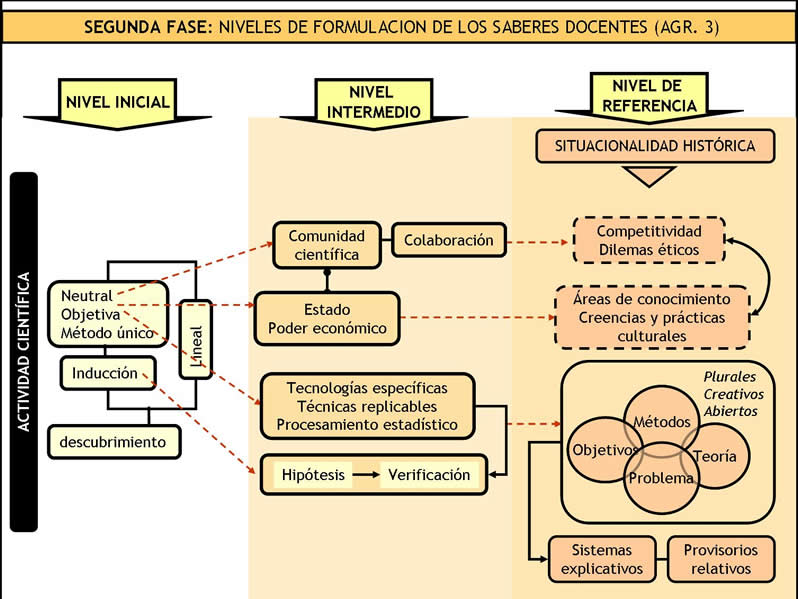 Una vez analizados en la primera fase todos los momentos de formación que conforman el agrupamiento 3, contábamos con la emergencia de un conjunto amplio de significados acerca del conocimiento científico y sus implicancias para diseñar las clases de ciencias. Con estos resultados procedimos a su modelización hipotetizando niveles de evolución del saber docente en términos de mayor complejidad e integración (Figura 7).