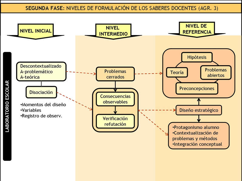 En un nivel de intermedio, el modelo avanza en un principio de articulación pero que traduce aún una perspectiva de linealidad. En este sentido se incorpora la consideración de problemas cerrados como punto de partida en la derivación de hipótesis formuladas como consecuencias observacionales y que han de ser verificadas o refutadas en el proceso de experimentación. Finalmente, y guardando coherencia con el nivel de referencia ya presentado, la reflexión sobre el laboratorio escolar incorpora la noción de diseño estratégico articulado, restaurando el papel de la teoría en la práctica experimental que es ahora concebida en el marco de procesos de aprendizaje por contrastación de esquemas de interpretación, contextualización de problemas y métodos e integración conceptual progresiva, con fuerte protagonismo del estudiante.